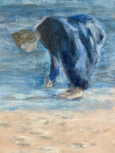Pinned to one of the inspiration boards I’d created in my home studio is this quote credited to Henri Matisse, “Don’t wait for inspiration. It comes while working.” My writing as work was not inspiring anything; so I switched gears and instead of writing started attending to my visual art. I reframed and reworked a few older pieces, prepped some canvases, did some drawing, and reorganized my studio, moving my easel and some supplies to different positions in the room. When I started to collate my photos and other papers, I found a few lovely blue pieces I had forgotten about. Blue is a color I am drawn to and I started to feel that shade working its magic. My creative juices warmed and the sputtering spark of my creativity strengthened. I knew I would use one of the blue photos as inspiration for a poem and a painted companion piece; and that is how Gathering Blue came to be.